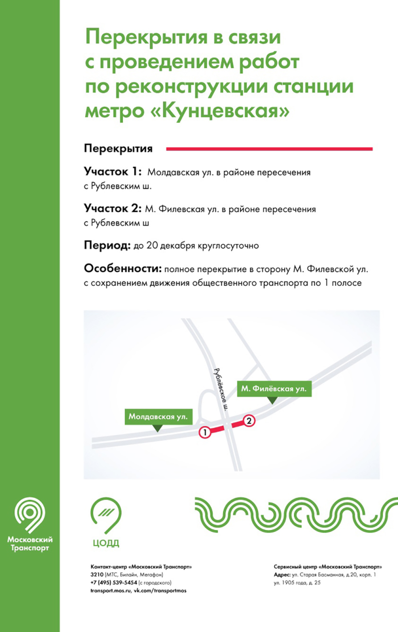 До 20 декабря круглосуточно перекрыто движение по Молдавской и Малой Филевской улицам на пересечении с Рублевским шоссе по направлению в центр.