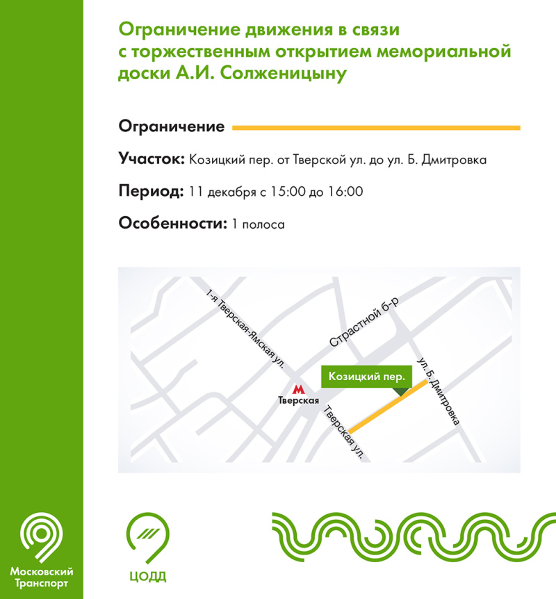 11 декабря с 15:00 до 16:00 ограничат движение в Козицком переулке от Тверской улицы до улицы Большая Дмитровка.