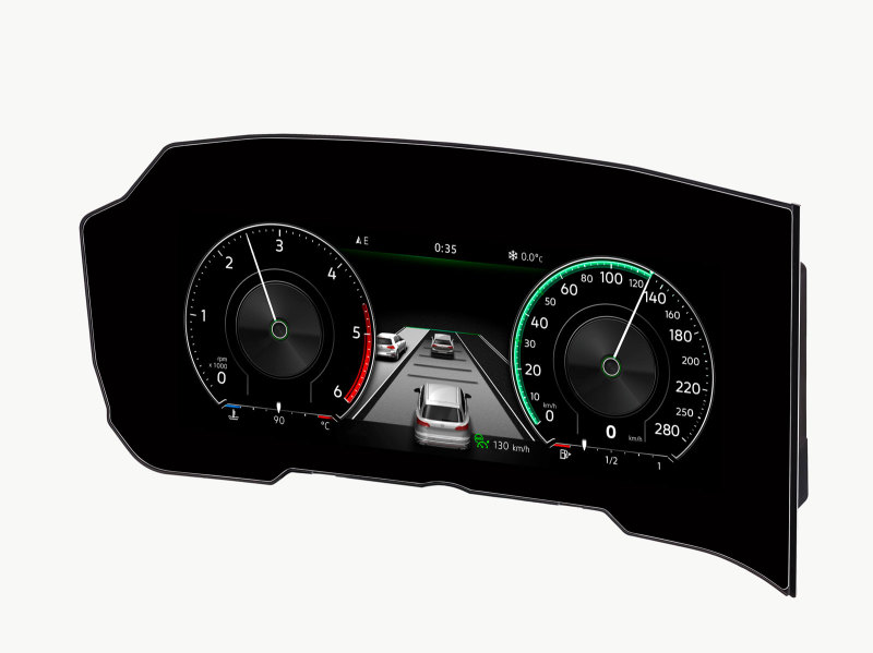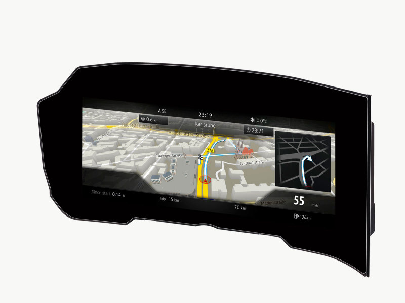 Volkswagen переходит с аналоговых технологий на легко настраиваемые, изогнутые цифровые дисплеи с высоким разрешением. В зависимости от того, какая информация необходима водителю, на экран выводятся навигационные карты, параметры движения или данные вспомогательных систем. Оптимального изображения (по резкости и контрасту) на дисплее удалось добиться благодаря новой технологии производства, которая позволяет снизить отражение света более чем в 4 раза.