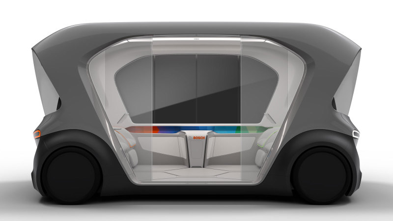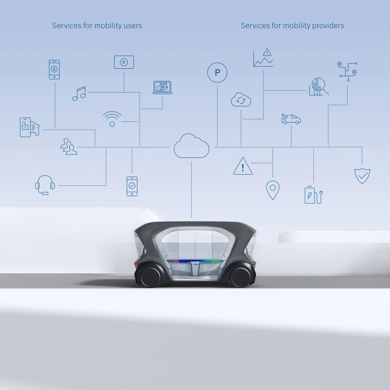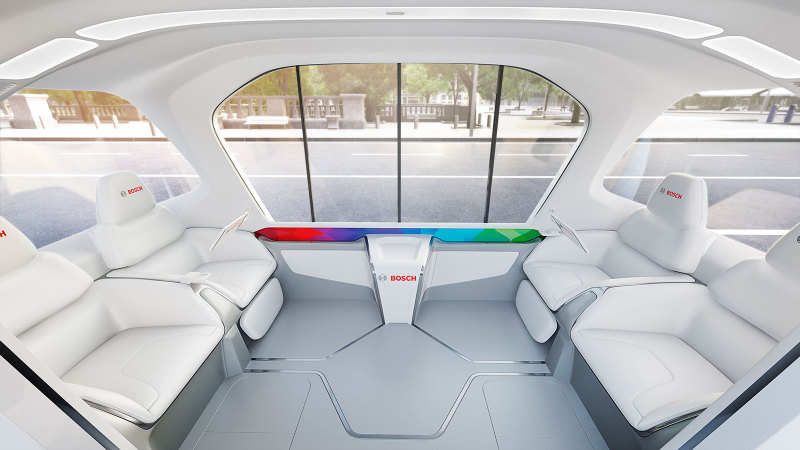 В этом транспортном средстве представлены технологии компании в сферах автоматизации, подключения к Интернету и электрификации. Посетители выставки смогли протестировать беспилотные шаттлы, которые скоро появятся на улицах. "Создание такого шаттла – вклад в нашу концепцию транспорта: без выхлопов, аварий и стресса", – комментирует член совета директоров Bosch, Маркус Хайн. Для перевозок на таких шаттлах Bosch поставит не только набор различных компонентов и решений, но и многообразие мобильных сервисов, таких как: бронирование поездки, поиск попутчиков, услуги по подзарядке и парковке. Bosch рассчитывает, что подобные подключенные сервисы необходимы для вождения и перевозок будущего.
