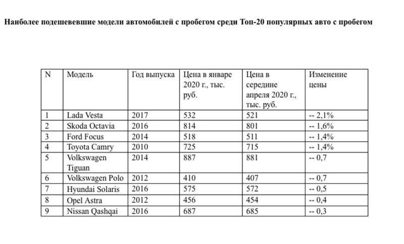 Одновременно цены на некоторые модели автомобилей с пробегом к середине апреля упали, здесь лидером снижения оказалась отечественная Lada Vesta 2017 с падением цены на 2,1% с 532 тыс. до 521 тыс. руб. Второе место занимает Skoda Octavia 2016: - 1,6% с 814 тыс. до 801 тыс. руб., а третье с падением на 1,4% делят Ford Focus 2014 (с 518 тыс. до 511 тыс. руб.) и Toyota Camry 2010 г.в. (с 725 тыс. руб. до 715 тыс. руб.).