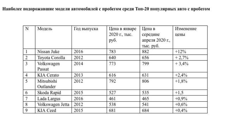Из Топ-20 популярных моделей с пробегом наибольший рост цены к середине апреля показала модель Nissan Juke 2016 года выпуска – стоимость этой машины увеличилась на 12% с 783 тыс. до 882 тыс. руб. Также на 3,4% с 773 тыс. до 799 тыс. руб. выросла цена модели Volkswagen Passat 2014 г.в., и на 2,7% поднялась цена на Toyota Corolla 2012 г.в. с 640 тыс. до 656 тыс. руб.