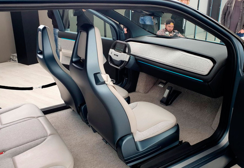 В минималистичном салоне нет физических кнопок, обращает внимание рулевое колесо, похожее на штурвал. У него встроенный дисплей, а также проекционный дисплей.