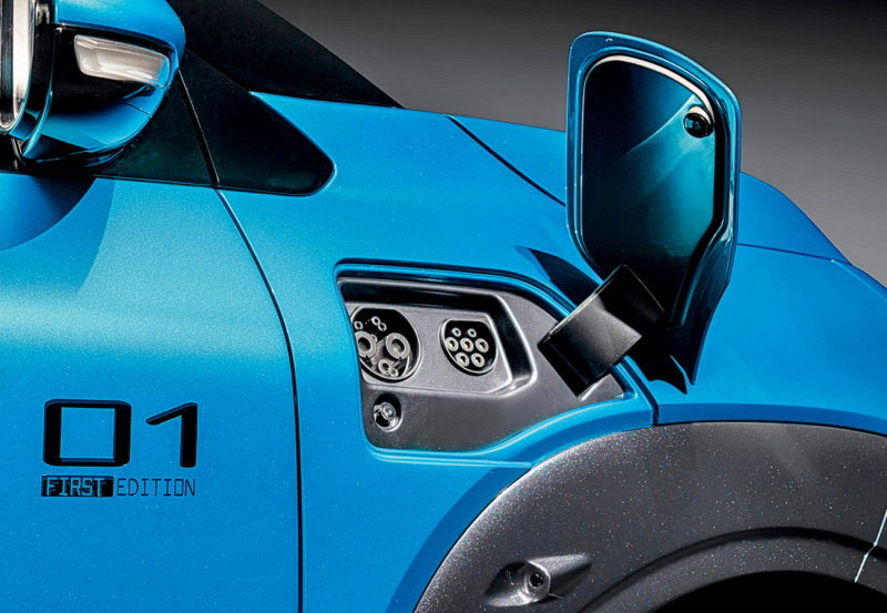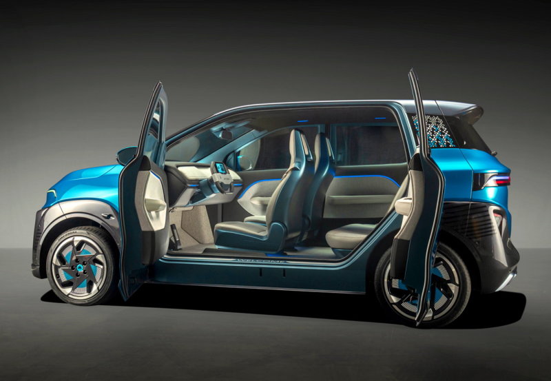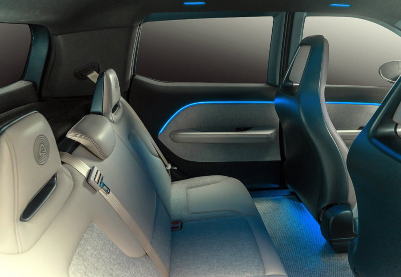У электромобиля распашные двери и нет центральной стойки кузова. В салоне сенсорный дисплей, расположенный на руле, отсутствие кнопок и экранов на передней панели.