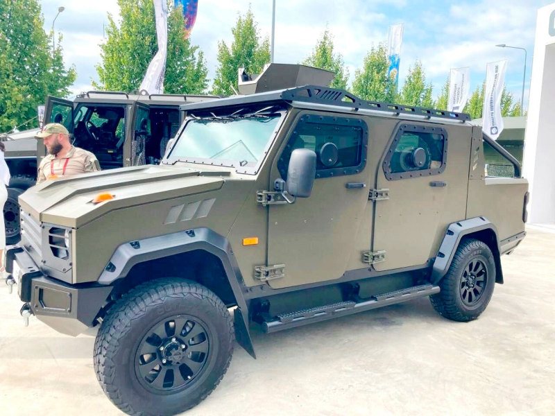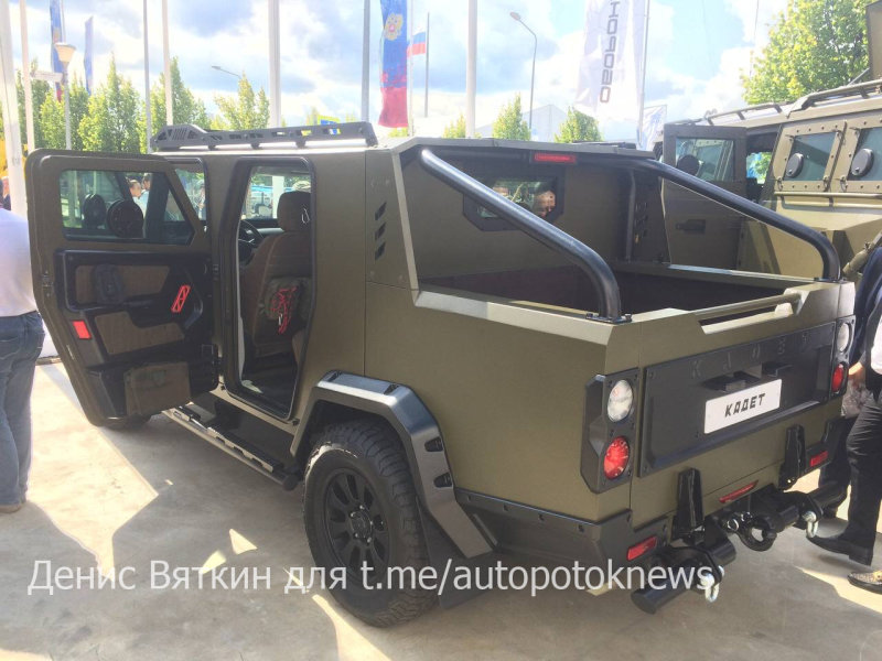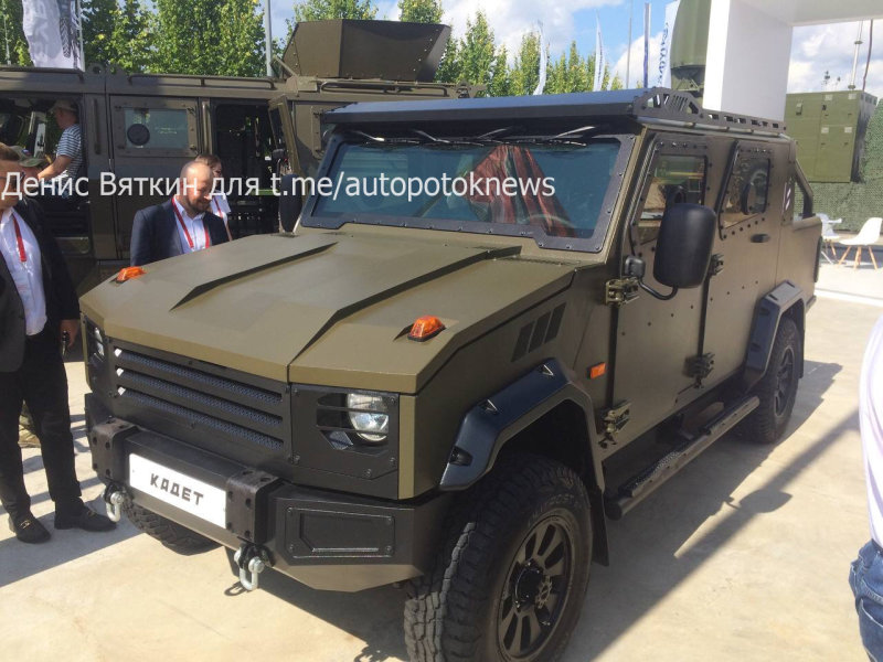 Пятиметровая машина появилась на форуме "Армия-2023". Внедорожник "Кадет" обладает кузовом типа четырёхдверный пикап. Основой является рамное шасси "Патриота", при этом здесь полностью оригинальный бронированный корпус.