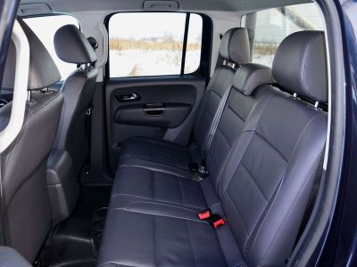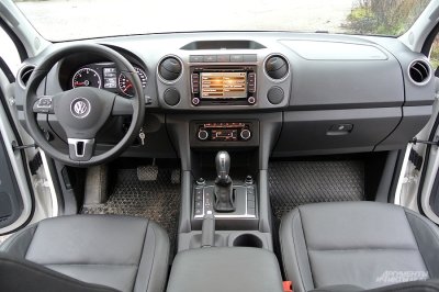 Фольксваген Амарок порадовал своим размером, большой и широкий. Огромный подлокотник в салоне между водителем и пассажиром. Очень удобные передние сидения, особенно в дальних путешествиях. Они легко настраиваются, а разложив их, можно спокойно спать. Не понравилось только, что немцы решили, что регулировку сидений будет удобнее осуществлять колесиком, а не пружинным механизмом. Ну и сам механизм раскладки сидений не слишком удобен. Задние пассажиры чувствуют себя поуютнее, чем на остальных пикапах, но все-таки угол сидений не слишком удобен.